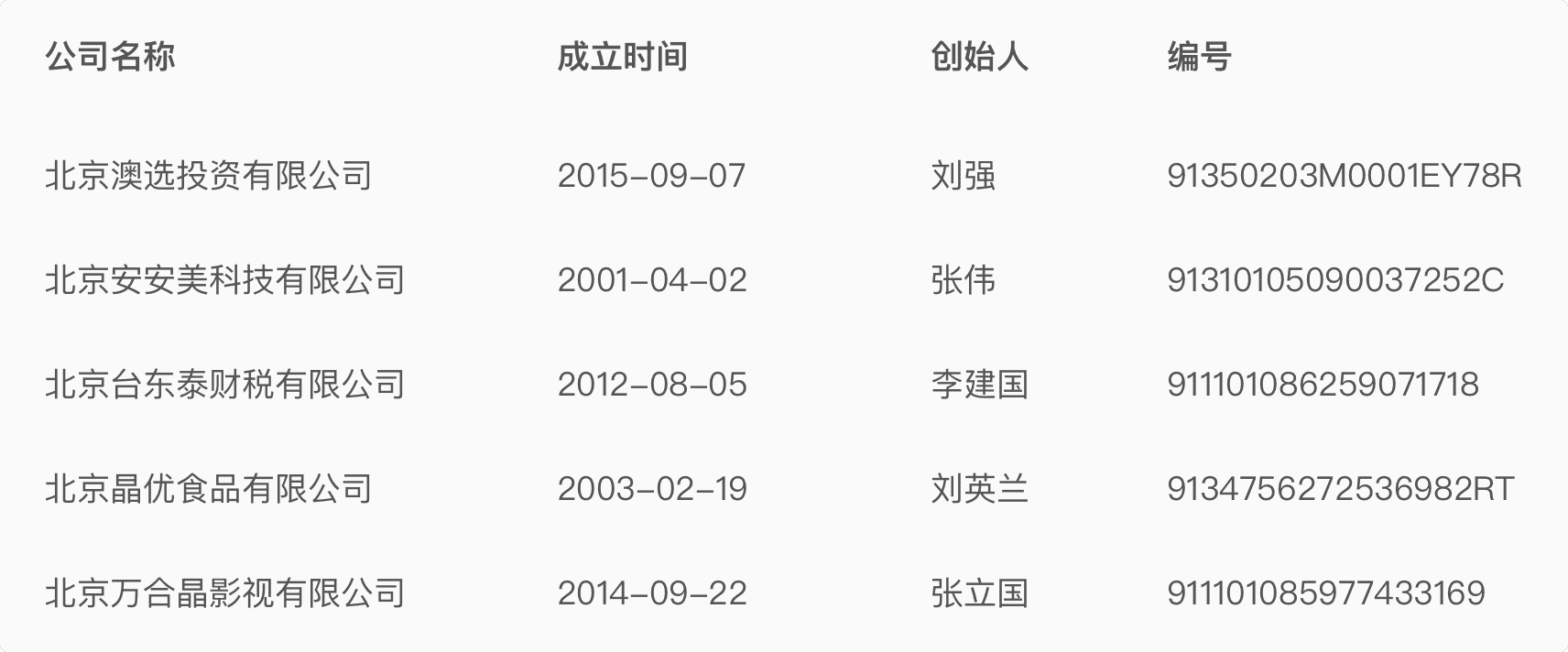 公司名稱 成立時間 創始人 編號